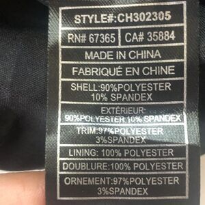 The jacket is made of a combination of polyester and spandex, and the lining is made of polyester. It is recommended to hand wash only to maintain the quality of the fabric. This jacket is a size medium and has a slim fit, making it flattering and stylish for any body type. Don't miss out on this versatile and chic addition to your closet.