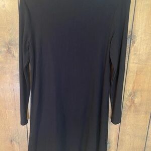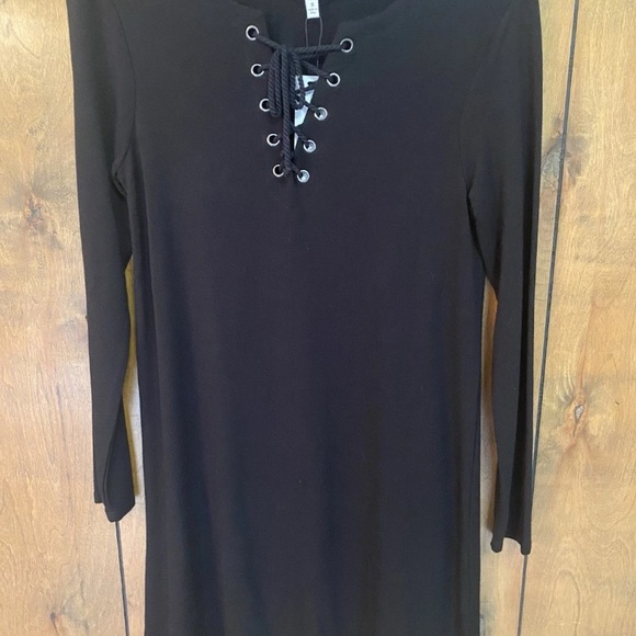 Chic black dress with lace-up front. Long sleeves for a sleek look. Perfect for versatile styling.