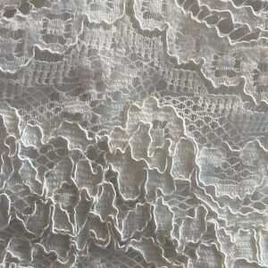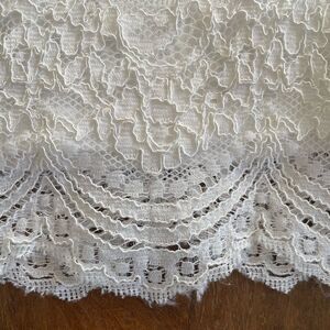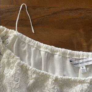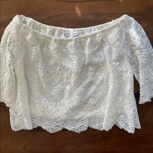 Stunning cream/white lace off-the-shoulder top from cupcakes & cashmere, size small.  Featuring elasticized neckline and shoulders for an easy fit and flattering silhouette, 3/4 length sleeves, lace overlay with scalloped hem, lined bodice, and semi-cropped length.  Good used condition with wear to fabric from wash/wear, and along hem, fraying of lace/fabric, broken hanger strap** (see photos/video for material composition); a tiny stain is noted to one area to the bottom left/front, barely noticeable.