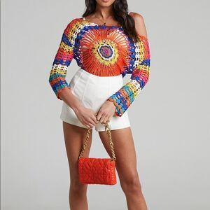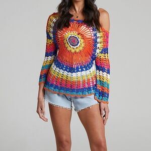 This vivid piece with multicoloured crochet detailing throughout and shaped with long sleeves and an asymmetric off the shoulder neckline for a modern twist. Tuck it into high rise shorts or let it hang loosely over distressed girlfriend jeans for a relaxed mood. No lining. Sheer crochet detailing. Loose fit.