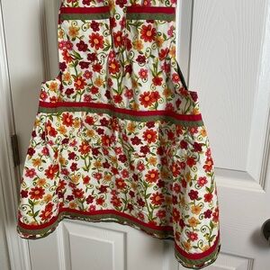 The apron features a floral pattern with red, orange, and green flowers and vines on a white background also green on the other side with small pockets pre-loved good condition