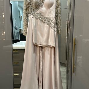 This beautiful dress designed by Tabja the idea was taken from TONY Ward couture it’s a size 8 unworn brand new nude and silver beating and stones detailing it’s short from the front and long from the back very royal