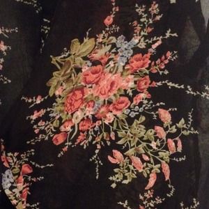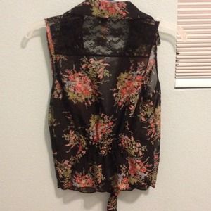 This cute flowery top is button up and it has lace on the back also it ties at the bottom.