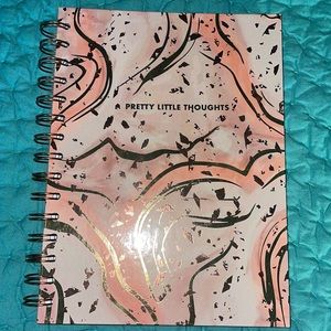 cute pink marbled hard cover notebook that says “pretty little thoughts” on the front.