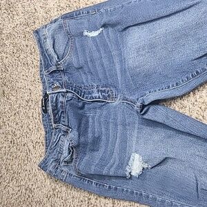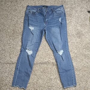These blue skinny jeans from d. jeans feature a modern distressed design with intentional rips and tears for a trendy, lived-in look. The medium-wash denim offers a classic appeal, while the clean-cut hem adds a touch of sophistication. Perfect for casual outings, these jeans combine style and comfort effortlessly.