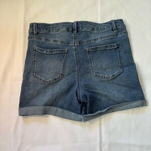 Chic dark blue jean shorts by d. jeans. Features distressed details and rolled cuffs. Ideal for casual wear.