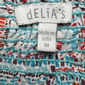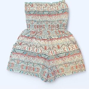 This vibrant jumpsuit from dELiA*s showcases a bohemian-inspired design with a strapless, elasticized top and a flowy silhouette. The red and blue hues create a striking pattern, perfect for casual summer outings. Its comfortable fit and intricate detailing make it a standout piece for any wardrobe.