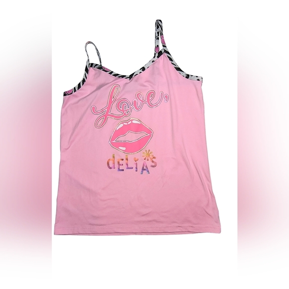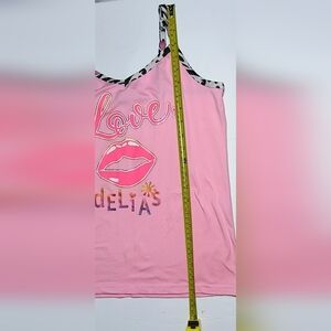 dELiA*s by Dolls Kill Super Soft Pink Love Y2K Animal Print Adjustable Straps Graphic Tank Top with Lip Design M. Vibrant pink tank featuring a stylish 'Love' graphic. Accented with a playful lip motif. Perfect for casual outings. In excellent pre-loved condition.