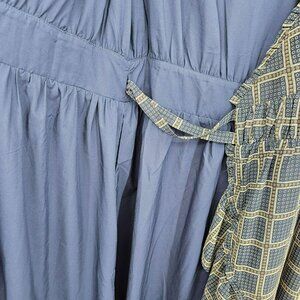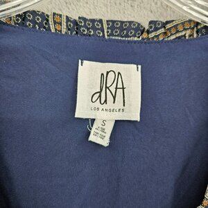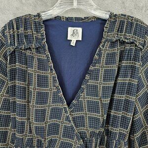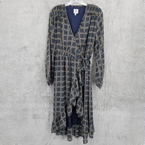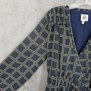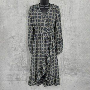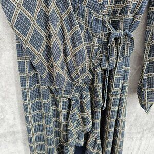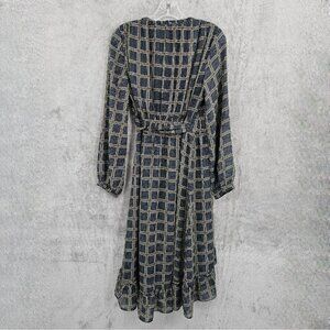 dRA Los Angeles Cicero Wrap Dress S Blue Brown Ruffled Lined Long Sleeve Retro
