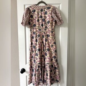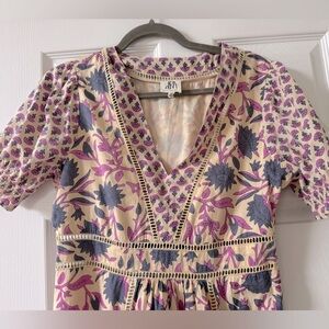 A provincial look of luxe, this short puff sleeve Delfina dress, cut in a spring-inspired print