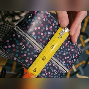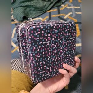 This box has 16 slots for oils. measurements are in pictures. it has a smell of oils on it. inside is lined. offers welcome!