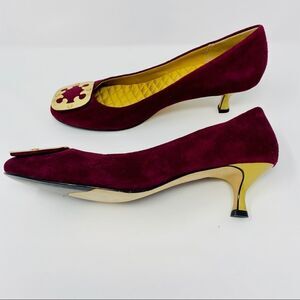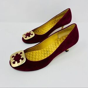 Gorgeous statement heels! These are in excellent condition in red (maroon) with gold heels. Size 9M.