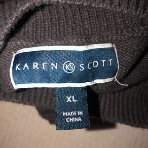 dark grey, 60% cotton and 40% acrylic, machine wash gentle cycle only, only, non-chlorine bleach when needed, tumble dry low, cool iron when needed. 100% recycled material. knitted sweater.