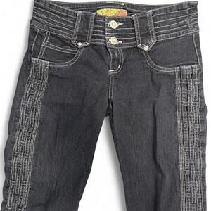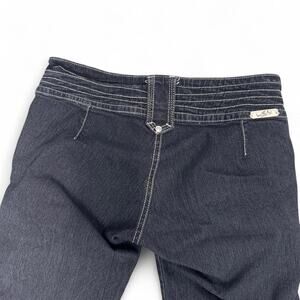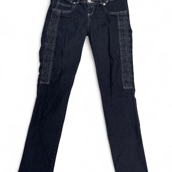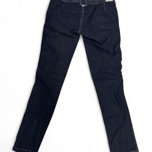 LEC dark wash low rise straight leg pants with contrast stitching. This is a kids 8 I would say it fits a women's 0 or 2 best