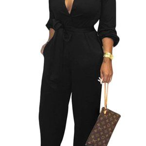This jumpsuit features a deep button down V-neck. Just what you need to spice up your date night.