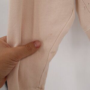Has a spot on the sleeve, two faint spots on the front waistline, and has damages on the front bottom side area, I can’t tell if its intended distressing or holes but its there see photos