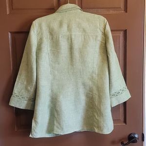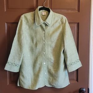 db Life- Linen green shirt with 3/4 length sleeves with eyelet trim. S/M.