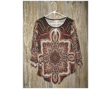 Womens size petite large brown, black, orange paisley keyhole top. It is made by db established and is 96% polyester and 4% spandex. It is in good preowned condition. Please see attached pictures for measurements. If you have any questions let me know.