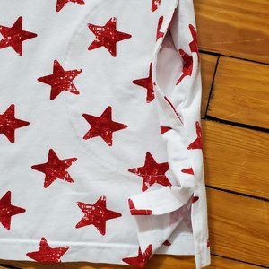 Bright white, high-quality tee with bold red stars on the front, back, and sleeves with usable side slash pockets and small side slits.