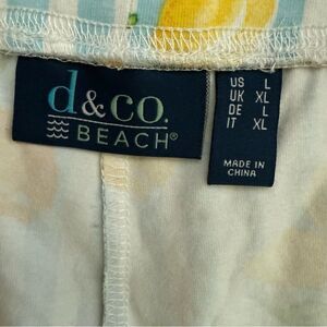 Unwind in style with these chic size Large citrus lemon print pajama pants from d&co Beach! In great condition with normal wear, these preowned pants feature a vibrant lemon and stripe pattern of white and blue, offering a fresh and cozy vibe perfect for a relaxing night in. Crafted from a soft, breathable cotton blend, they include an elastic waistband making them ideal for lounging or sleeping. There are 2 pockets on the sides. The wide-leg design adds a touch of effortless elegance to your loungewear collection.