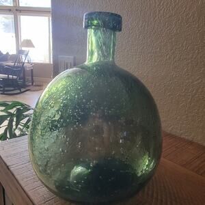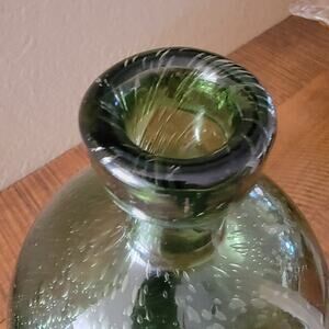 This vintage handblown glass vase features a rich olive-green color with a rounded demijohn-style form. Standing approximately 9 inches tall with a 7-inch wide bulbous body and a 2-inch mouth opening, the vase is beautifully proportioned for display or use as a decorative vessel. The glass contains natural bubble inclusions throughout, a hallmark of traditional handblown techniques that adds character and texture to the piece. Its narrow neck and rounded body make it perfect for displaying single stems, dried flowers, or as a standalone sculptural accent. The pontil scar at the base indicates handcrafting, further enhancing its authenticity as a vintage piece. With its organic charm and timeless simplicity, this vase suits interiors from rustic farmhouse to mid-century modern and minimalist. In excellent vintage condition with light wear consistent with age, this piece is both collectible and versatile, adding a touch of artisan glassmaking to any space.