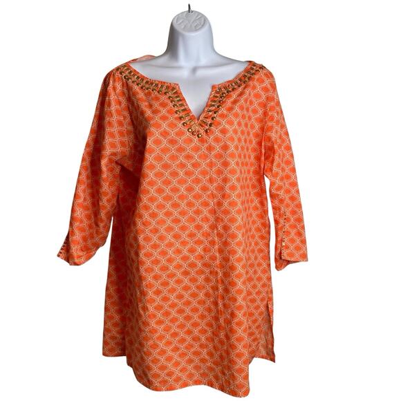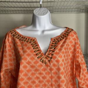 dei Women's Orange Moroccan Tile Beaded Tunic Top Size M Boho Gypsy Art To Wear