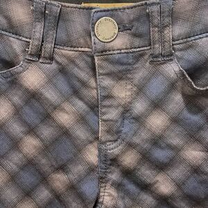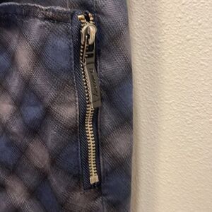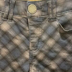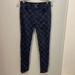 Democracy woman’s blue and black checkered jeans. They have a little side zip on both sides of the jeans. They are a size 4.