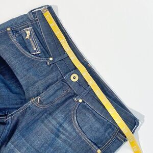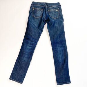 &denim dark wash structured skinny jean. Thick rigid denim, zippered back pockets and indigo wash. Skinny leg.