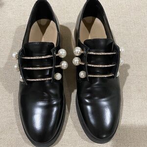 black leather upper and leather lining derby shoe with pearl and crystal bar piercing detail European size size 37 US size 6 1/2 worn couple times in a great condition