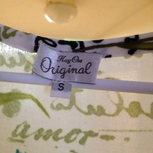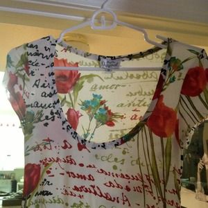 Gorgeous summer dress ! Has French writing and flowers with round neck . Super fitted with small slot on both sides of dress at bottom .