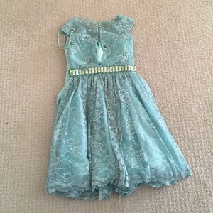 this is a beautiful dress that i only wore once. it is a light blue/teal color. it is lace and has rhinestones across the middle and some on the top half of the dress. the back is completely lace as shown in the last picture so a bra would be seen. however it has a sort of built in padding making a bra completely unnecessary. there is a zipper on the side making it very easy to put on. size 0. i am small so it didn't fit me quite right. please let me know if you have any questions!