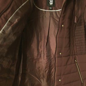 New with tags!!! comes with plastic cover. d.e.t.a.i.l.s - Size Chart: Large- 12-14. Bust 39" - 41", Waist 32" - 33", Hip 42.5" - 44.5" PRODUCT FEATURES: Attached hood, Long sleeves, Heavyweight, 2 pockets. FIT & SIZING: Designed to hit just below the waist, Snap & zipper closure, Center back length: 28". FABRIC & CARE: Polyester, Machine wash - Delicate- Imported. Color: "merlot" smoke free home