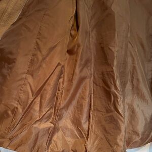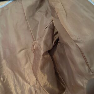 Warm winter jacket, tan with gold details, zipper pockets, & zipper / button close. Inner lining torn at one arm pit, pocket, and back. Outside of jacket is in good condition, slight pilling but could be removed.