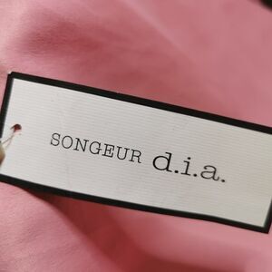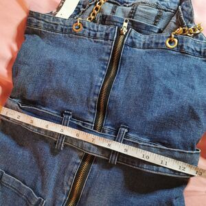 New with tags D.I.A. Denim Romper, One Size, bust and waist measurements shown in photo. Features floral-lined pockets, a hidden pocket inside the top, chain straps, and a zippered back.