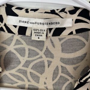 The product is a women's blouse by the designer Diane von Furstenberg in size 6. It is made from 100% silk and features a geometric print in black. The blouse is designed for regular fit and is perfect for adding a touch of sophistication to any outfit. Made from high-quality silk material, this blouse is not only stylish but also luxurious and comfortable to wear.