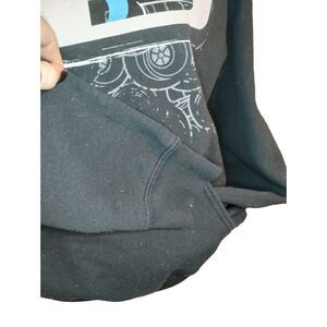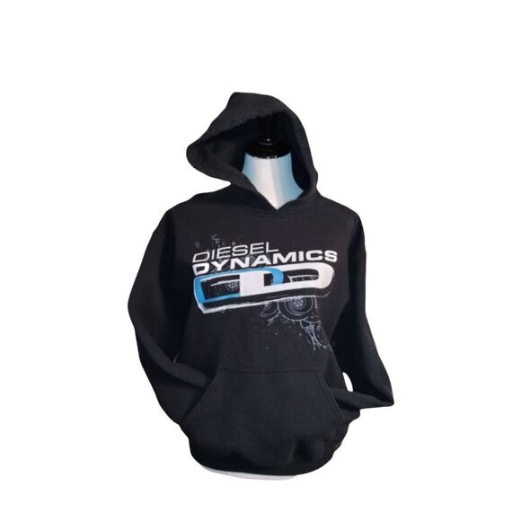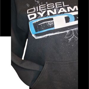 Black hoodie with Diesel Dynamics screen printed logo in blue and white. size medium