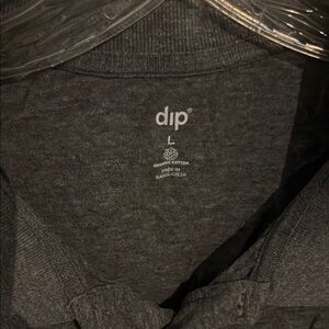 This dip polo shirt features a dark charcoal gray color with stylish white piping along the collar and sleeves. Designed with short sleeves, it offers a classic and comfortable fit, perfect for casual outings.