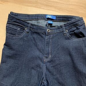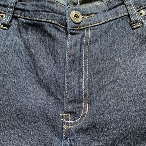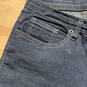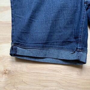 Denim Bermuda shorts are deep navy blue with white and tan stitching. Front zipper. Five pockets. Back pockets button. Belt loops. Small amount of stretch. 2” cuff. Waist flat across is 19”. Hips flat across is 22”. Inseam 9”.