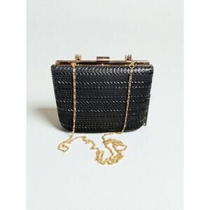 Elevate your evening style with this d’margeaux New York Black Chevron Clutch Purse. Featuring a glossy textured finish and a chic gold-tone metal frame with curved handle, this compact statement bag exudes timeless elegance and vintage-inspired glam. New in box, with minor wear to the box from storage; the clutch itself is pristine and ready for any special occasion.