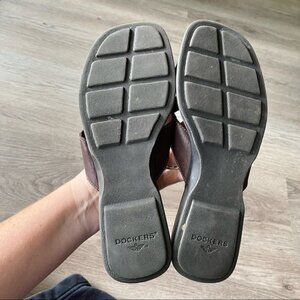 dockers Women’s Strappy Flip Flops Square Toe Brown Leather Upper Toe Post Sz 8.5. Super soft leather lined footbed. Comfy. Rubber soles. 90’s/Y2K vibes.