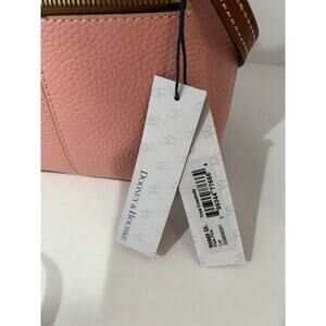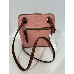 The Dooney Bourke Cross Body handbag in pink and brown leather is a stylish and versatile accessory for women. This medium-sized bag features a crescent shape with a zip closure, adjustable crossbody strap in pink, and pebbled finish exterior. The bag is perfect for travel, casual outings, workwear, and business events, with lined interior, inner pockets, and a zip-around feature for added convenience. The pink hardware accents and stainless steel hardware add a touch of elegance, making it a designer piece from the Trixie Crossbody collection by Dooney & Bourke.