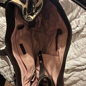 dooney & bourke giraffe print leather shoulder bag with a logo lock clasp.