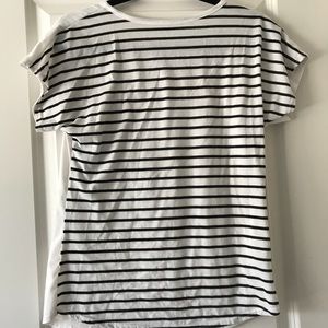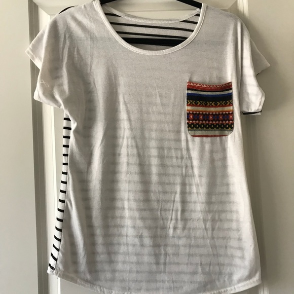 front of shirt is white with tribal pattern on pocket, back is white and black stripes. worn once.