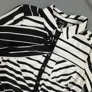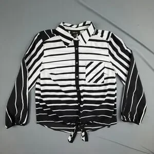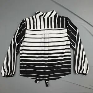 Black and white striped button-front blouse with a tie-front hem and relaxed silhouette. Lightweight woven fabric with long sleeves and elastic cuffs. Easy to dress up for work or wear casually with denim.