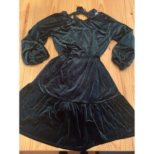 New without tags. However it does appear that one part where belt goes through the loop may have been repaired. I tried my best to capture this. Price reflects. This is a gorgeous green color. Has a tie in the back at waist and at the top of shoulders.