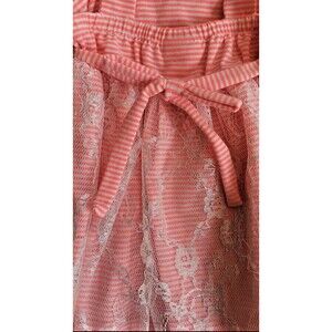 This beautiful, brand new Sweet Heart Rose dress is perfect for any special occasion. The coral striped pattern is complemented by a delicate lace overlay, making it a stunning addition to any little girl's wardrobe. The dress features strappy sleeves, a pullover closure, and an empire waist, with a knee-length hemline.