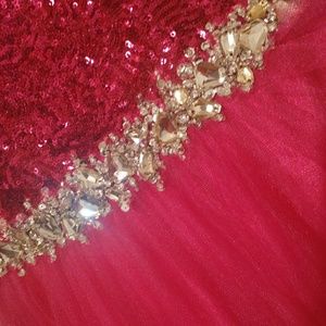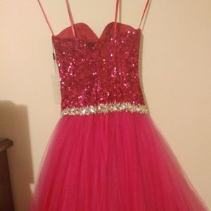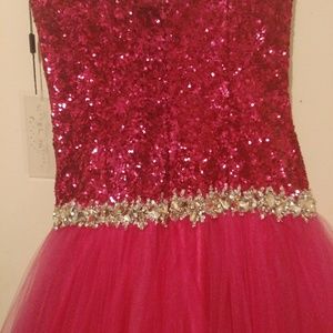 It is a strapless ball gown. The color is fuchsia. It is from the brand night moves. Dress has never been worn. Lighting is bad so pics may look different or weird. Zipper sticks a little that can be fixed. I can fix the loose thread on back before shipping.