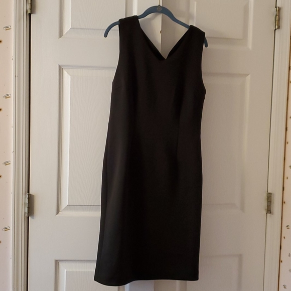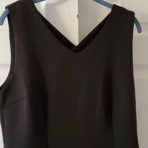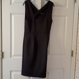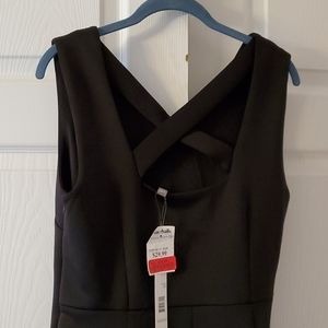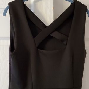 black dress, v neck, scooped back with criss cross details. Never worn.