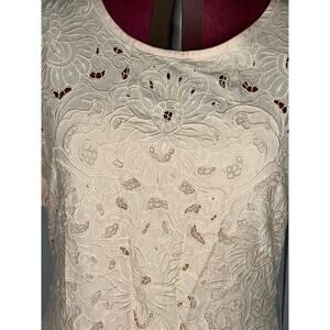 wonderful vintage 1980s romantic dress, cutwork lace bodice, swing skirt, button back , bow at the back of the neck. had removable shoulder pads and only one is present. has one small stain on the front left just below the collar. 100% rayon