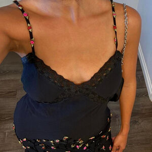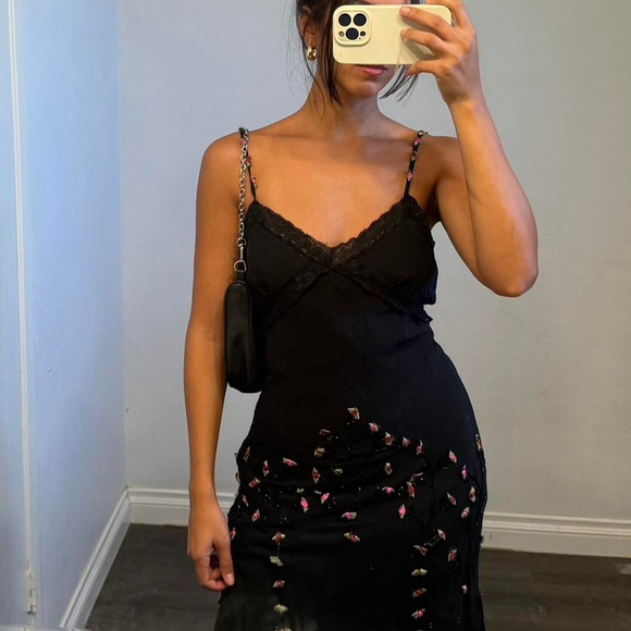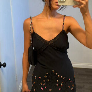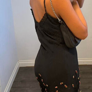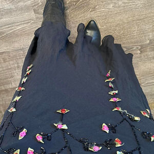 100% silk! So unique! Flowers embroidered all over it! V neckline with spaghetti straps with embroidered flowers!